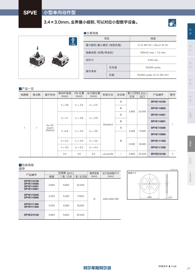 立式 / 小型按动动作型 ・ 最大额定值:0.1A 30V DC ・ 动作力:0.3N max. ・ 操作寿命(无负载):50000 cycles。