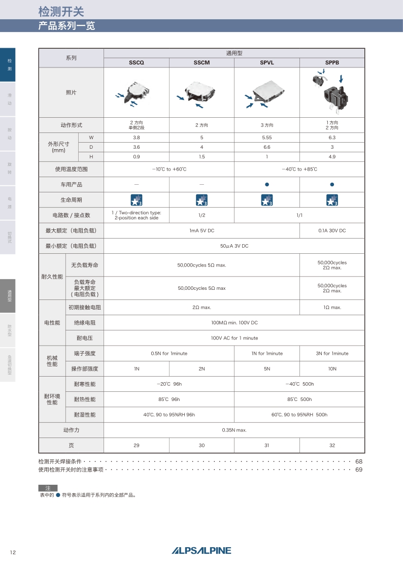 卧式 / 薄型多方向动作型 ・ 最大额定值:1mA 5V DC ・ 动作力:0.35N max. ・ 操作寿命(无负载):50000 cycles。