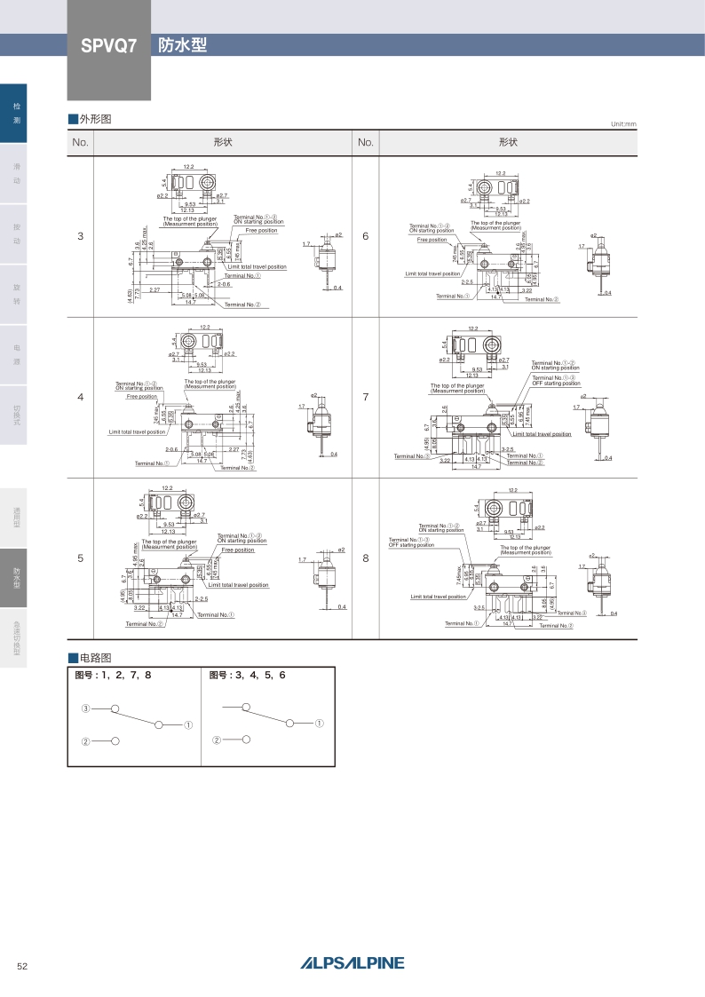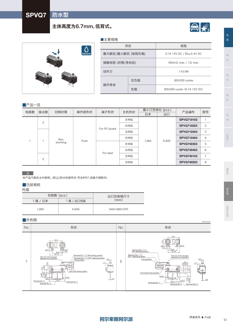 防水型 ・ 最大额定值:0.1A 12V DC ・ 动作力:1±0.5N ・ 操作寿命(无负载):300000 cycles ・ 防水及防尘型:IP67。