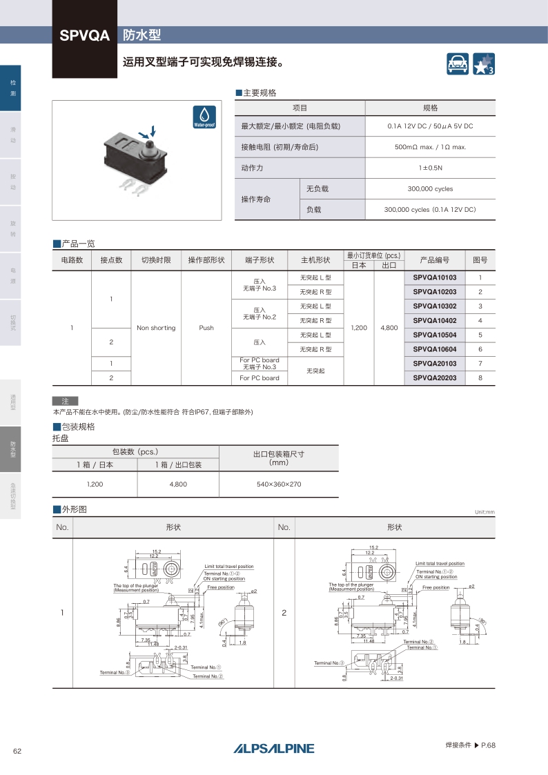 防水型(叉型端子) ・ 最大额定值:0.1A 12V DC ・ 动作力:1±0.5N ・ 操作寿命(无负载):300000 cycles ・ 防水及防尘型:IP67。