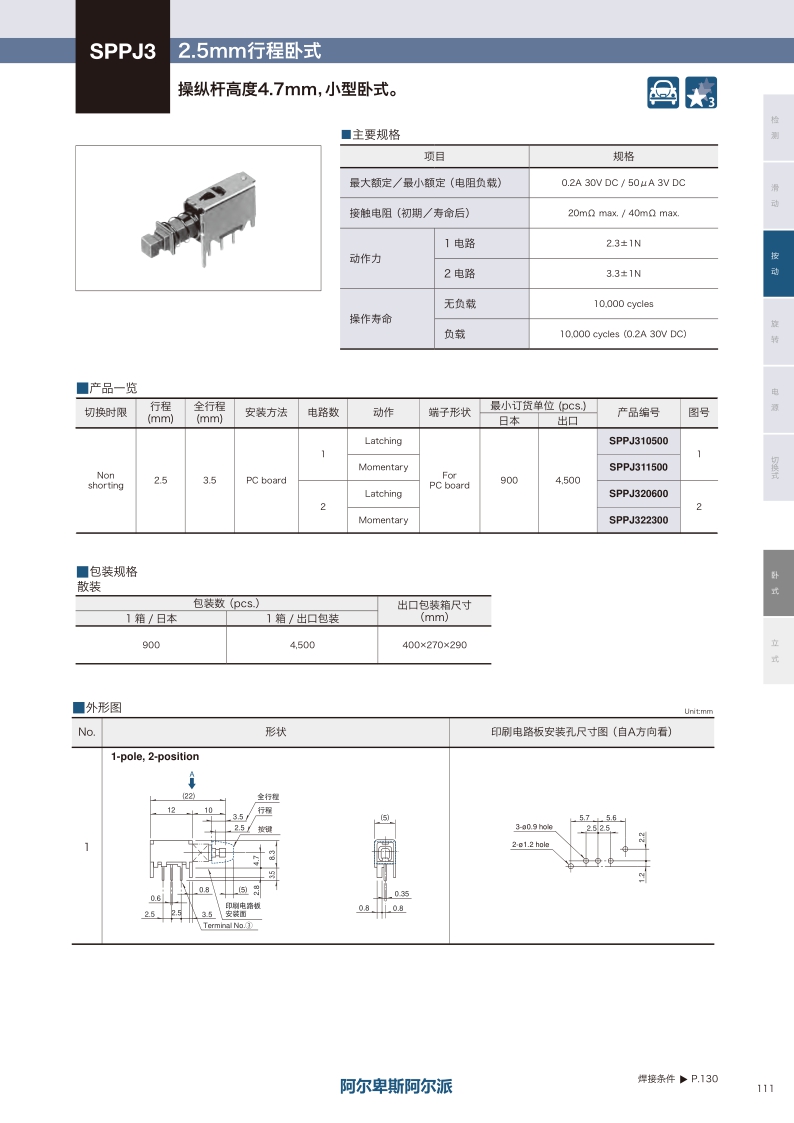 操纵杆高度4.7mm 小型卧式。操作方向:Horizontal ・ 最大额定值:0.2A 30V DC ・ 行程:2.5mm ・ 电路数:1/2-pole。