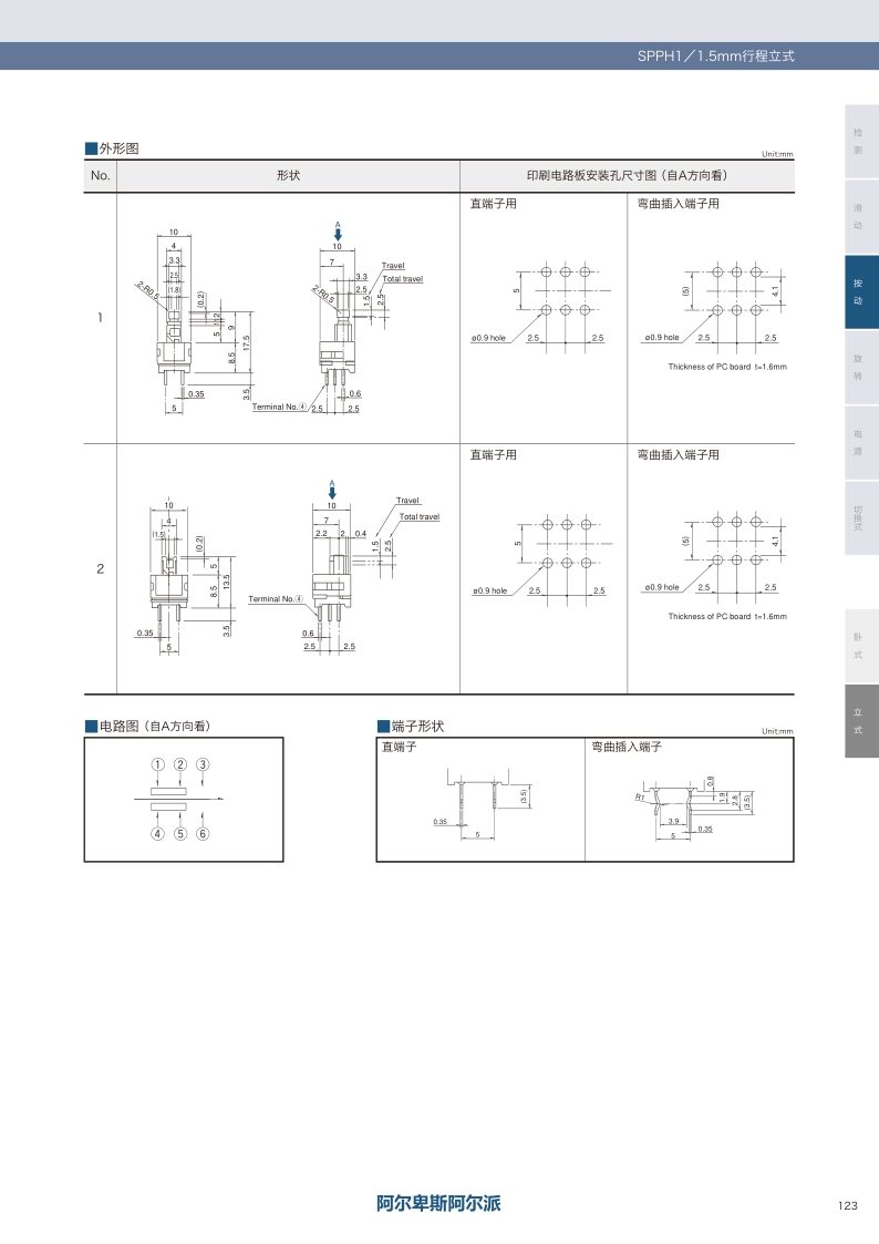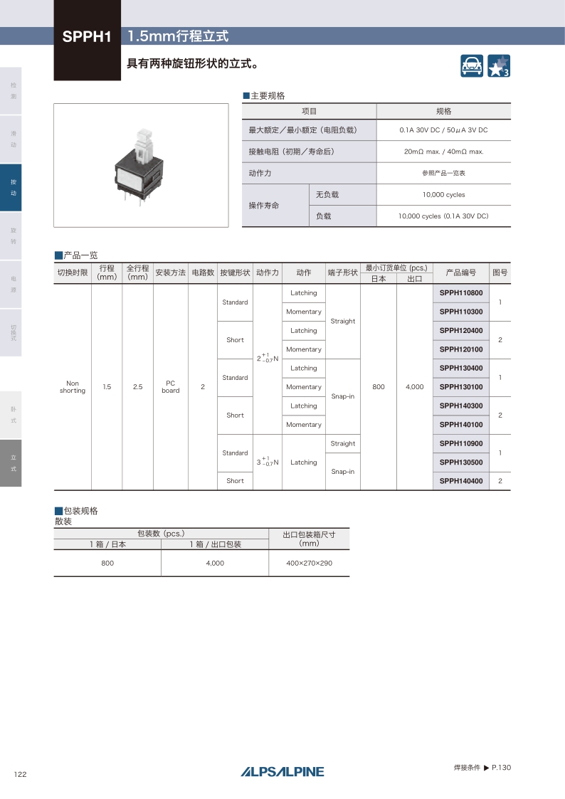 具有两种旋钮形状的立式。操作方向:Vertical ・ 最大额定值:0.1A 30V DC ・ 行程:1.5mm ・ 电路数:2-pole。