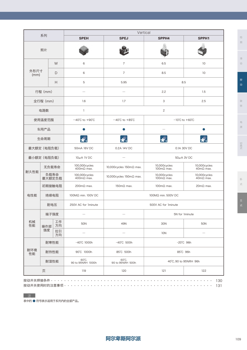 产品编号 照片 切换时限 行程 全行程 动作力 安装方法 电路数 按键形状 动作 端子形状 尺寸(W×D×H)