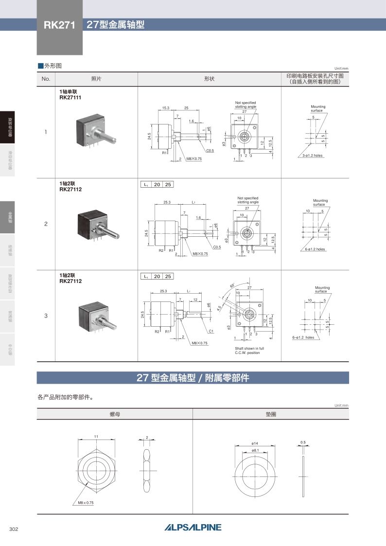 RK271系列卓越的操作感觉高特性电位器。型:金属轴 ・ 外形尺寸:27型 ・ 电阻体数:单联,2联 ・ 附属开关:无。