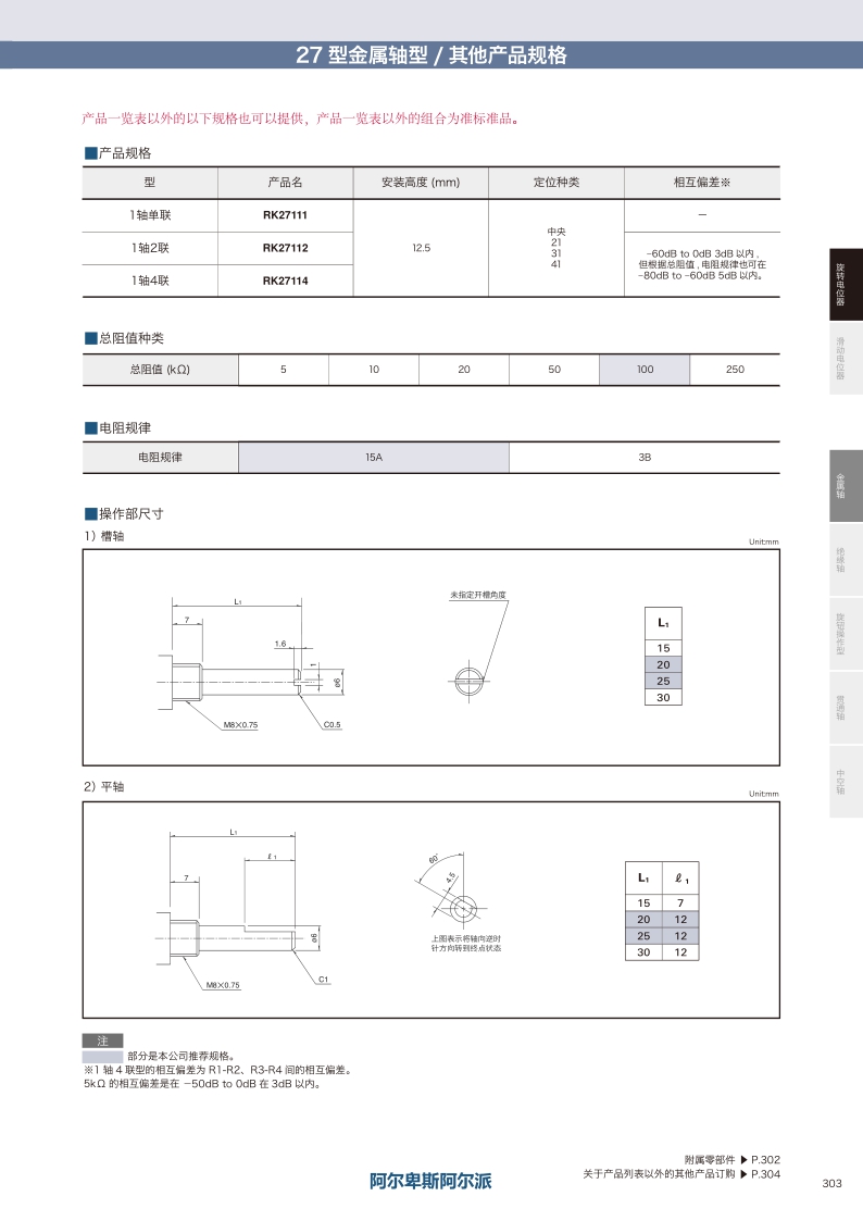 产品编号 照片 操作轴数 电阻体数 操作部方向 軸受固定方法 操作部形状 操作部长度 定位 总阻值 电阻规律 尺寸