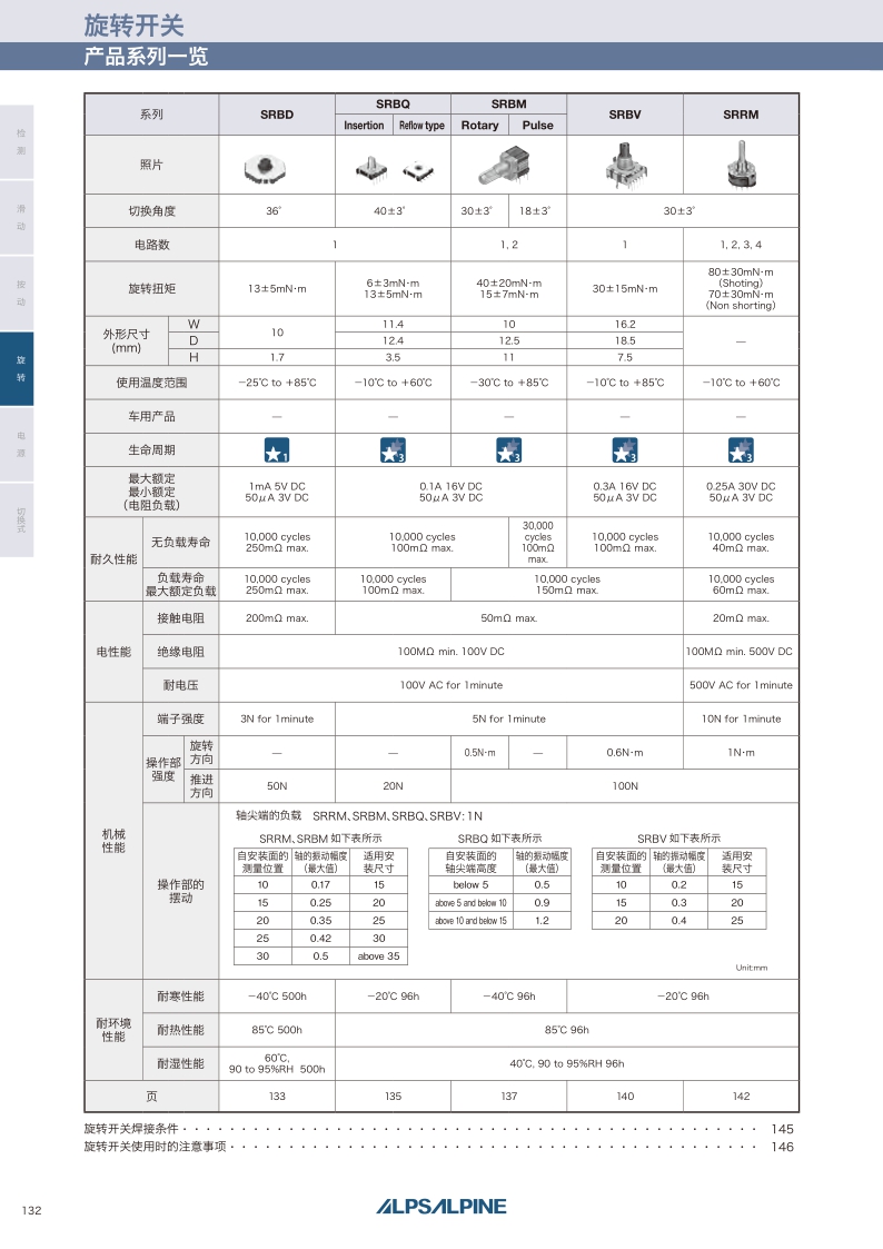 产品编号 照片 电路数 接点数 切换角度 切换时限 旋转扭矩 操作部形状 操作部长度 尺寸(W×D×H)