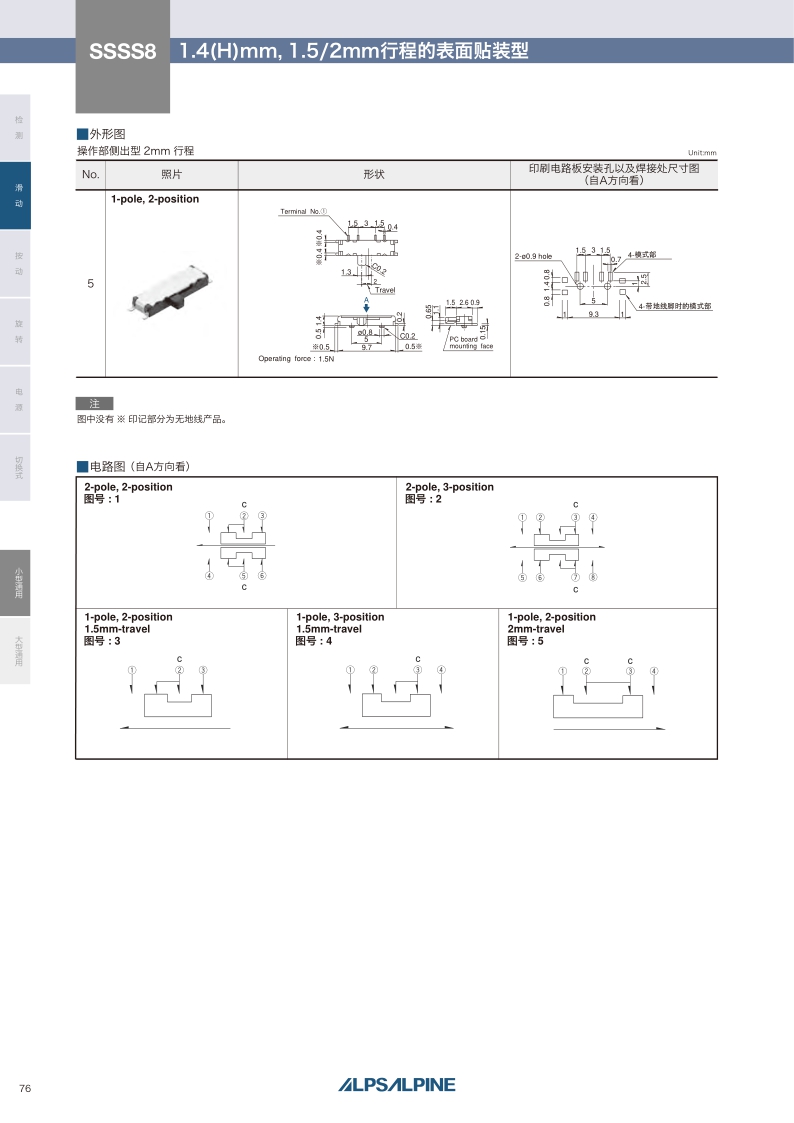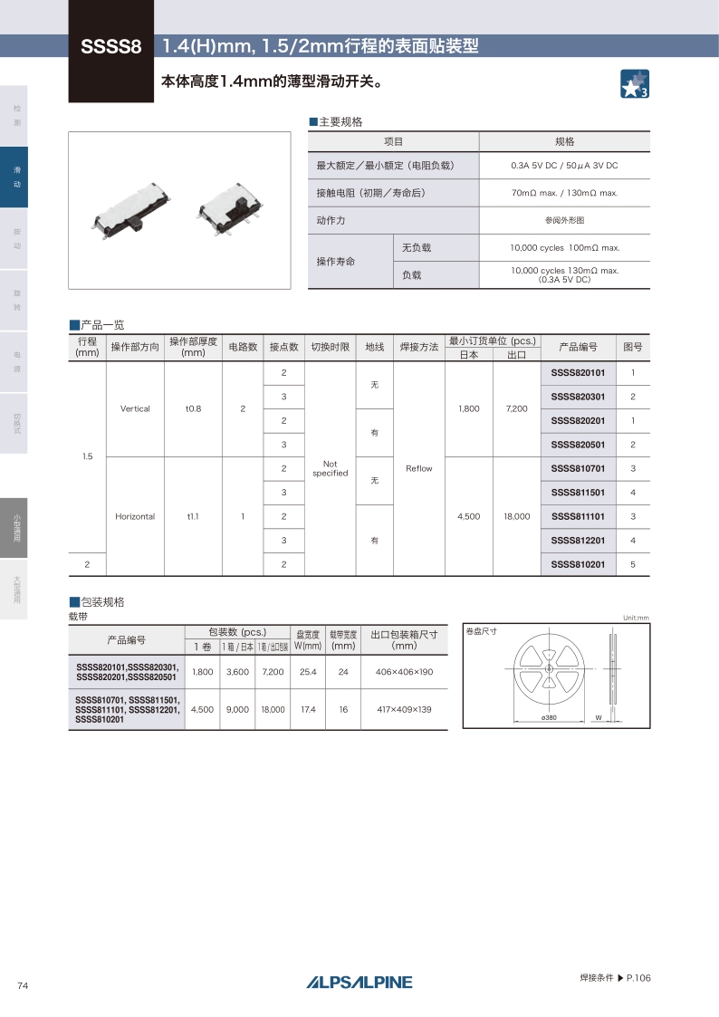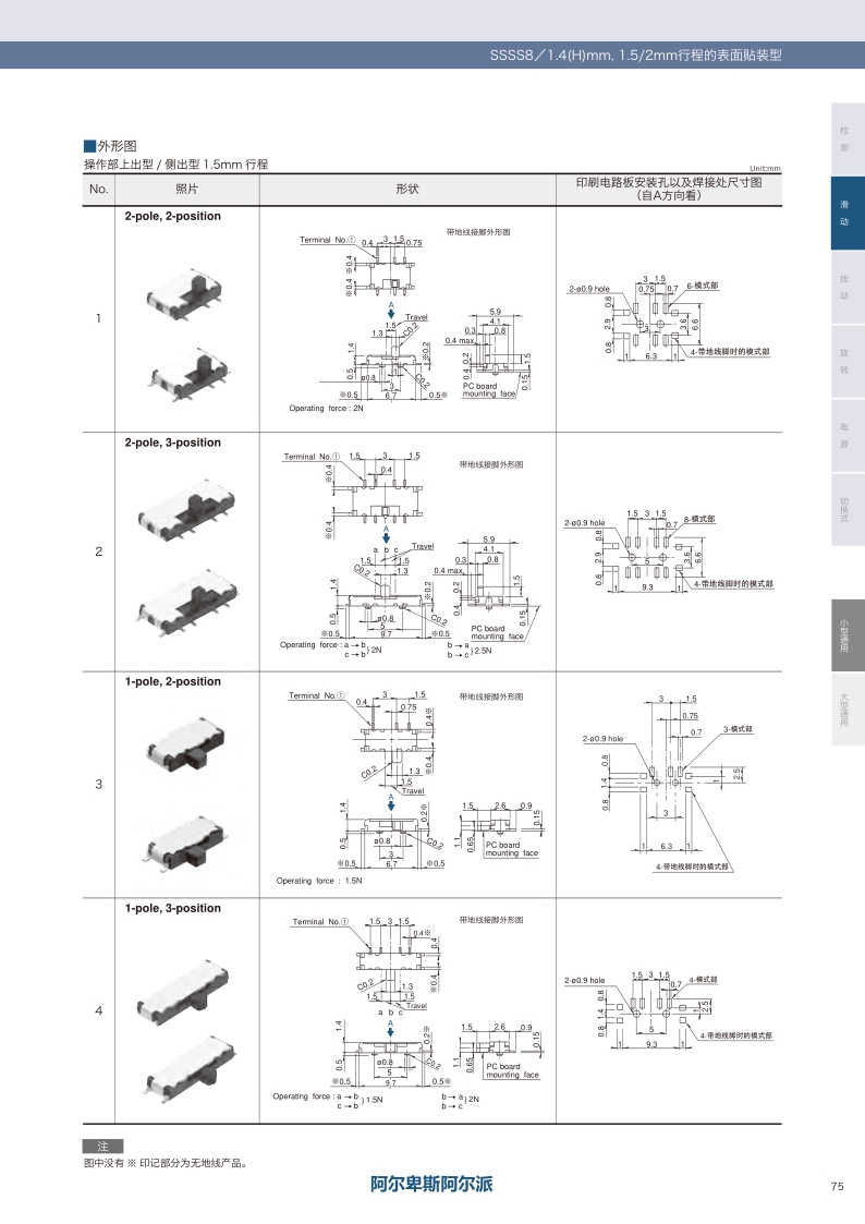 产品编号 照片 行程 操作部方向 操作部厚度 电路数 接点数 动作力 切换时限 接地端子 焊接方法 尺寸(W×D×H)