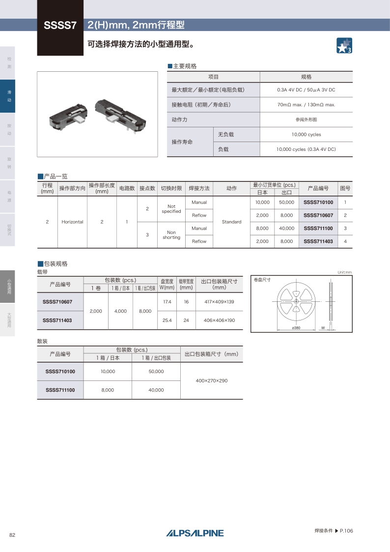 产品编号 照片 行程 操作部方向 操作部长度 电路数 接点数 动作力 切换时限 焊接方法 操作 尺寸(W×D×H)
