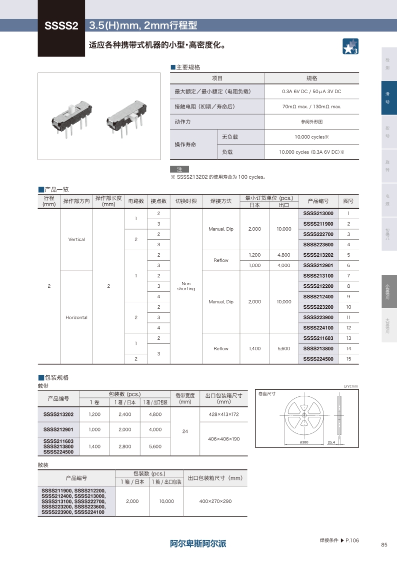 适应各种携带式机器的小型·高密度化。操作方向:Vertical Horizontal ・ 安装高度:3.5mm ・ 行程:2.0mm ・ 最大额定值:0.3A 6V DC ・ 电路数:1/2-poles。