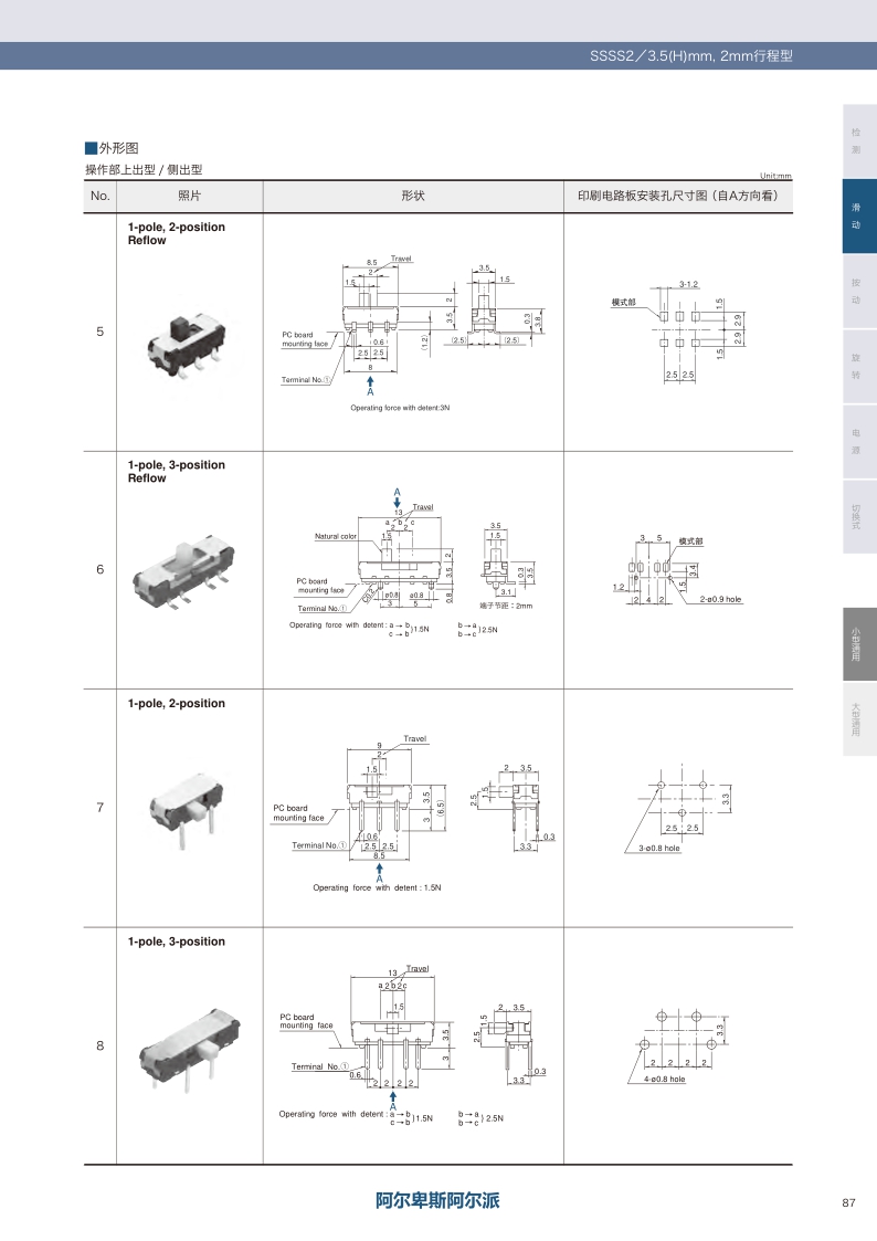 产品编号 照片 行程 操作部方向 操作部长度 电路数 接点数 动作力 切换时限 焊接方法 尺寸(W×D×H)