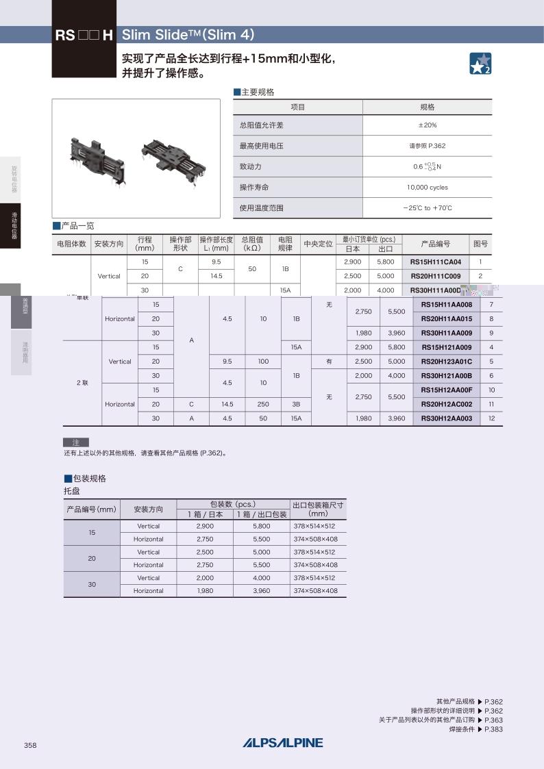 产品编号 照片 电阻体数 安装方向 行程 操作部形状 操作部长度 总阻值 电阻规律 定位 Tap