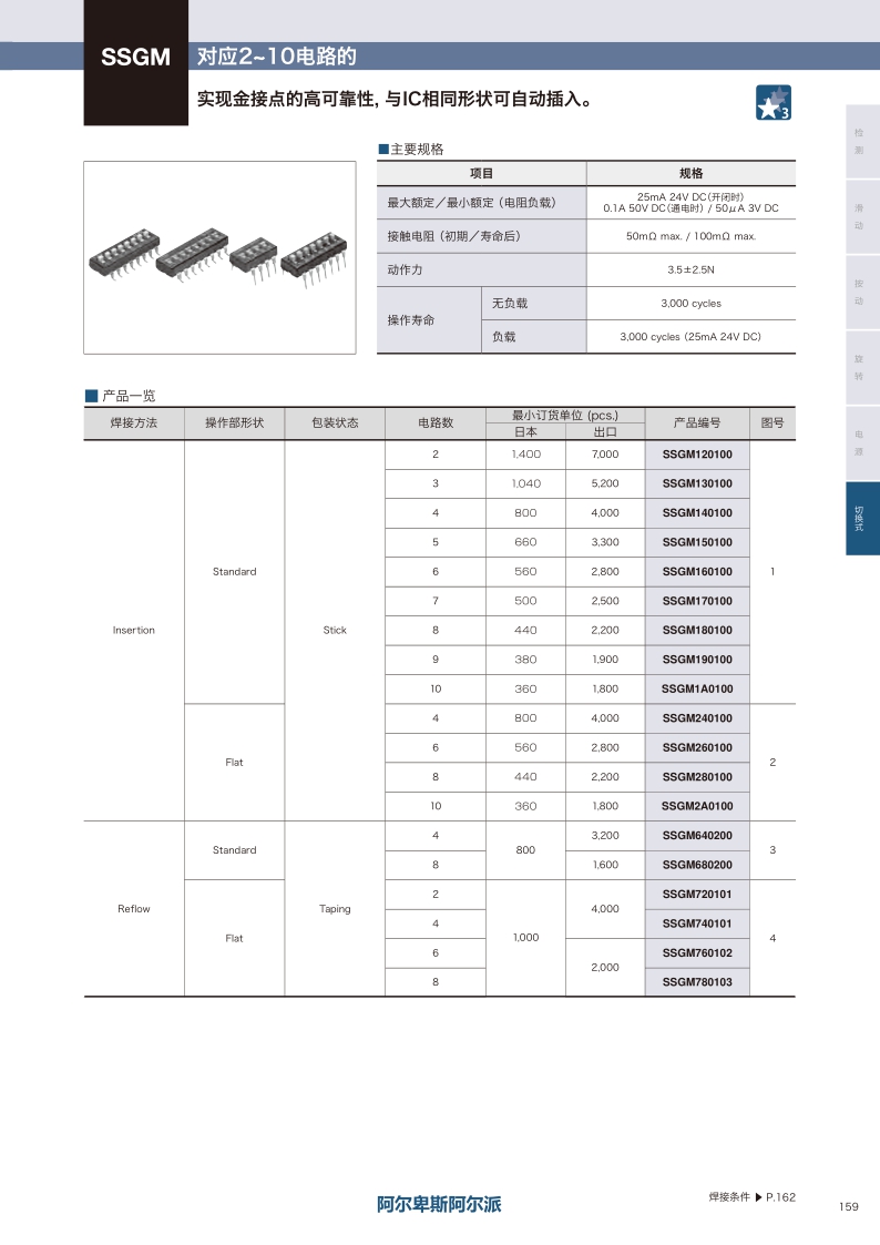 实现金接点的高可靠性 与IC相同形状可自动插入。最大额定值:0.1A 50V DC(通电时) ・ 电路数:2 to 10-poles ・ 备注:Available in reflow solderable。