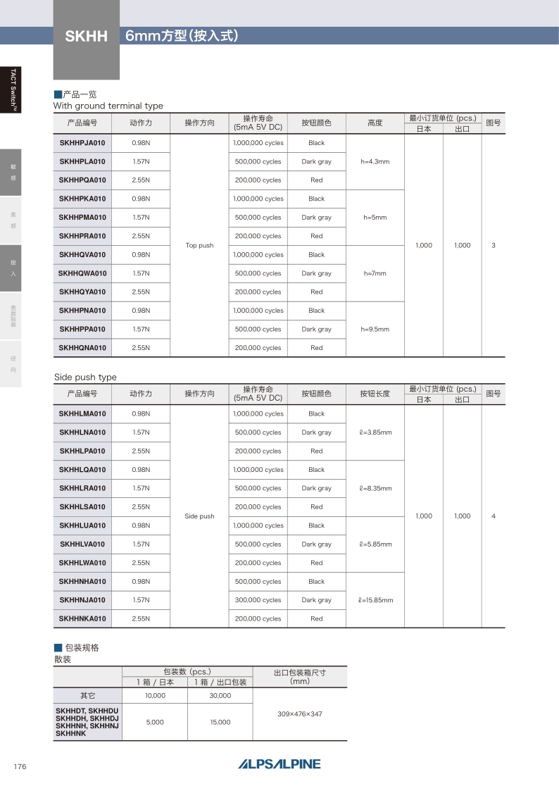 SKHHPPA010 照片 按入 1.57N Top push 0.25mm 500,000 cycles 100mΩ max. Dark gray 9.5mm 6.0×6.0×9.5mm