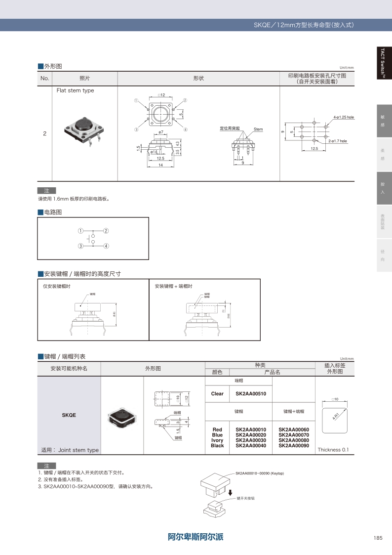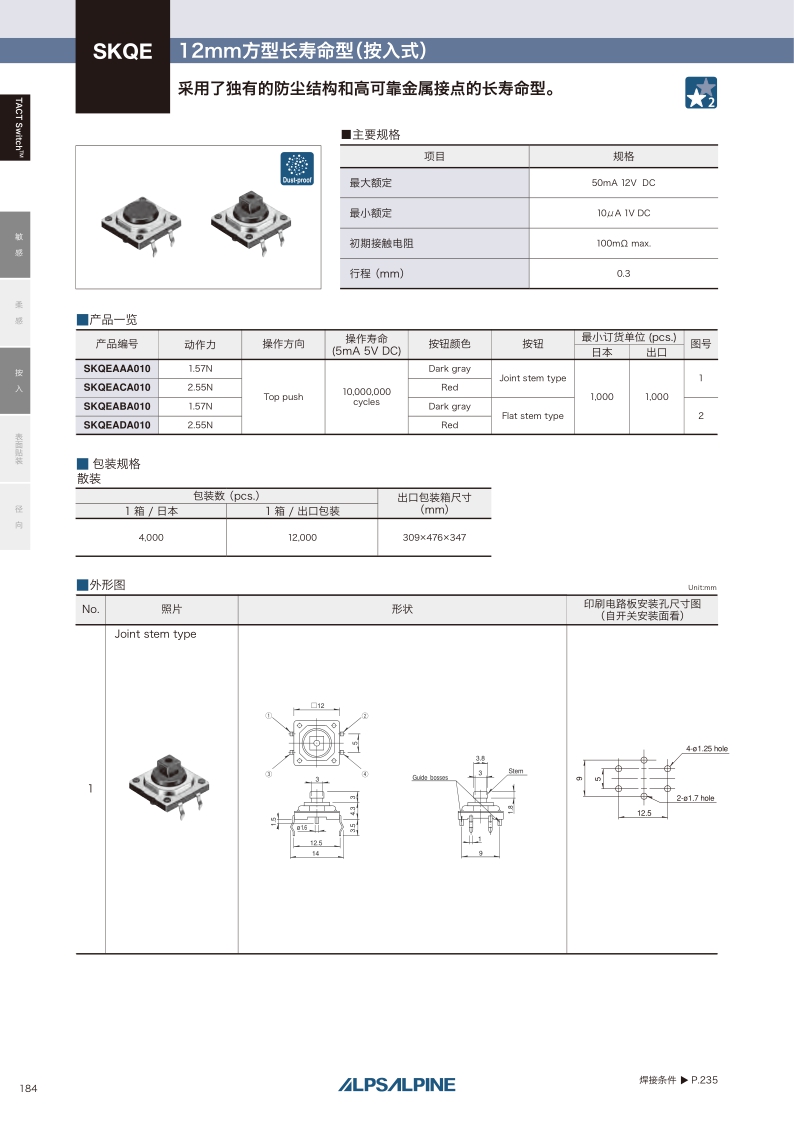 采用了独有的防尘结构和高可靠金属接点的长寿命型。操作感觉:敏感 ・ 贴装方式:按入 ・ 尺寸(W×D×H):Joint stem: □12.0×7.3mm Flat stem: □12.0×4.3mm ・ 特长:防尘型 长寿命。