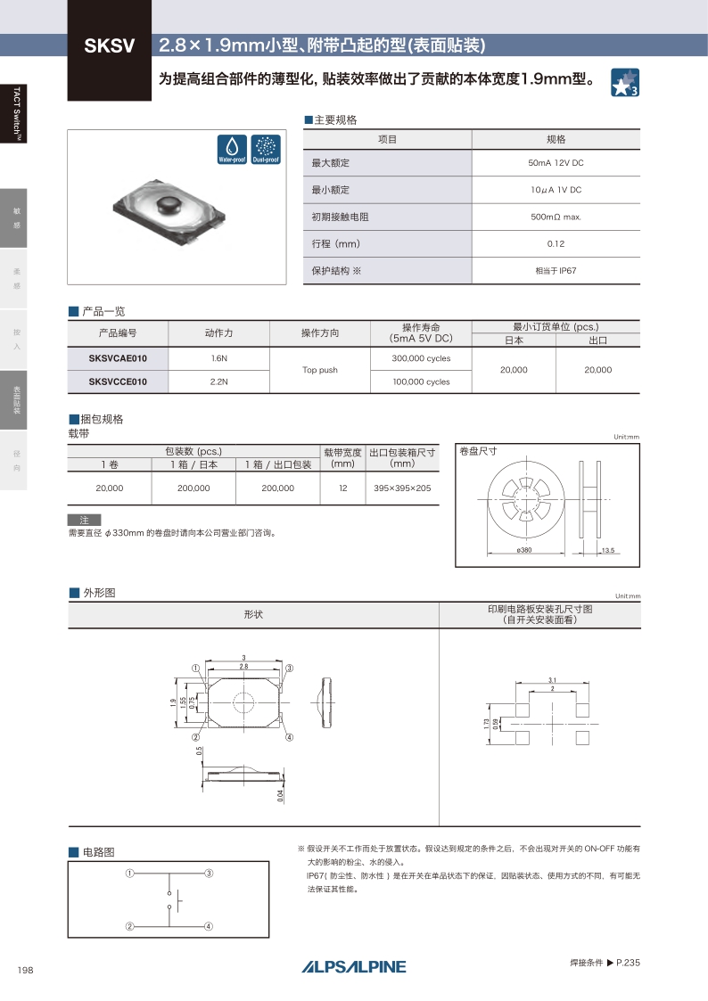 SKSVCAE010 照片 Surface mount 1.6N Top push 0.12mm 0.5mm 300,000 cycles 500mΩ max. IP67 2.8×1.9×0.5