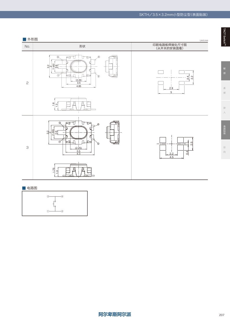 SKTHBAE010 照片 Surface mount 3.0N Top push 0.12mm 2.5mm 200,000 cycles 500mΩ max. IP6X 3.5×3.2×2.5
