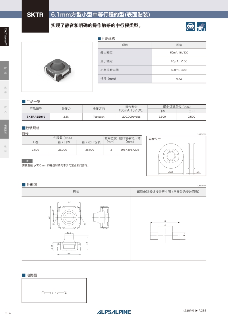 6.1mm方型小型中等行程的型(表面贴装)SKTR系列型号:SKTRAEE010