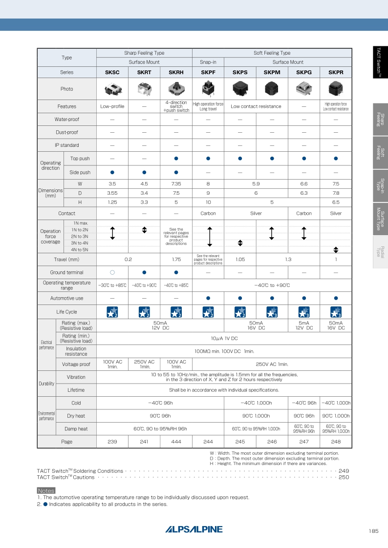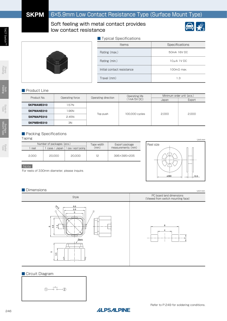 操作感觉:柔感 ・ 贴装方式:表面贴装 ・ 尺寸(W×D×H):5.9×6.0×5.0mm ・ 特长:低接触电阻