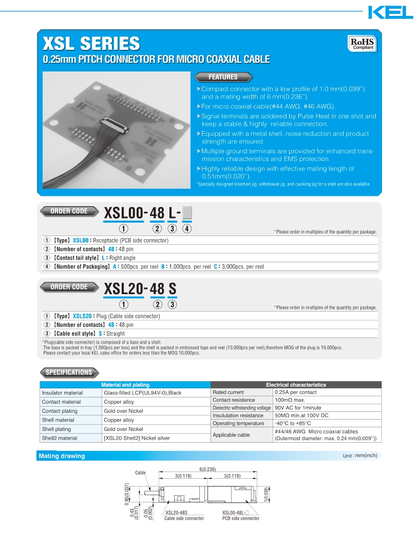 KEL极细同轴电缆连接器产品“XSL系列”是用于0.25毫米螺距微同轴线缆,XSL00-48L业界最低的产品的水平的连接器。用于微同轴线缆0.25毫米间距用连接器,AWG#4446,插座(基板侧连接器),直角型,48个磁极,装箱数3000。