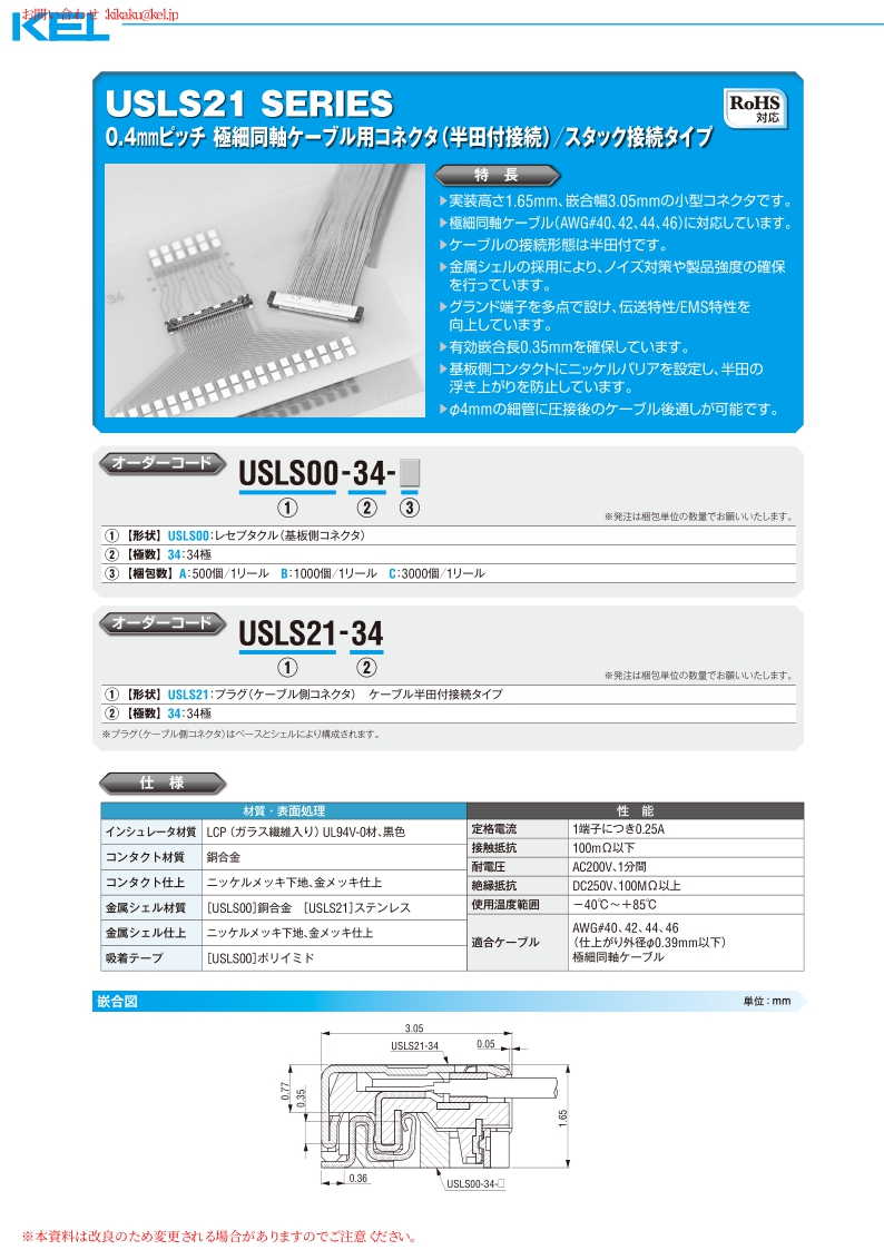USLS21系列采用0.4mm间距设计,电缆焊接,超细同轴电缆(AWG#40,42,44,46)型,堆叠连接型,插头(电缆侧连接器),34Pin。