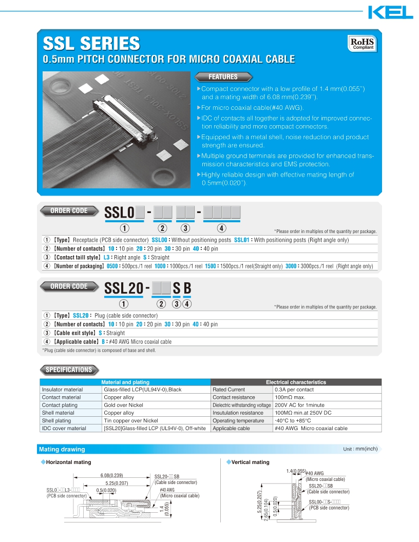 SSL系列采用0.5mm间距设计,压接连接器,超细同轴电缆(AWG#40)型,插头(电缆侧连接器),直型。